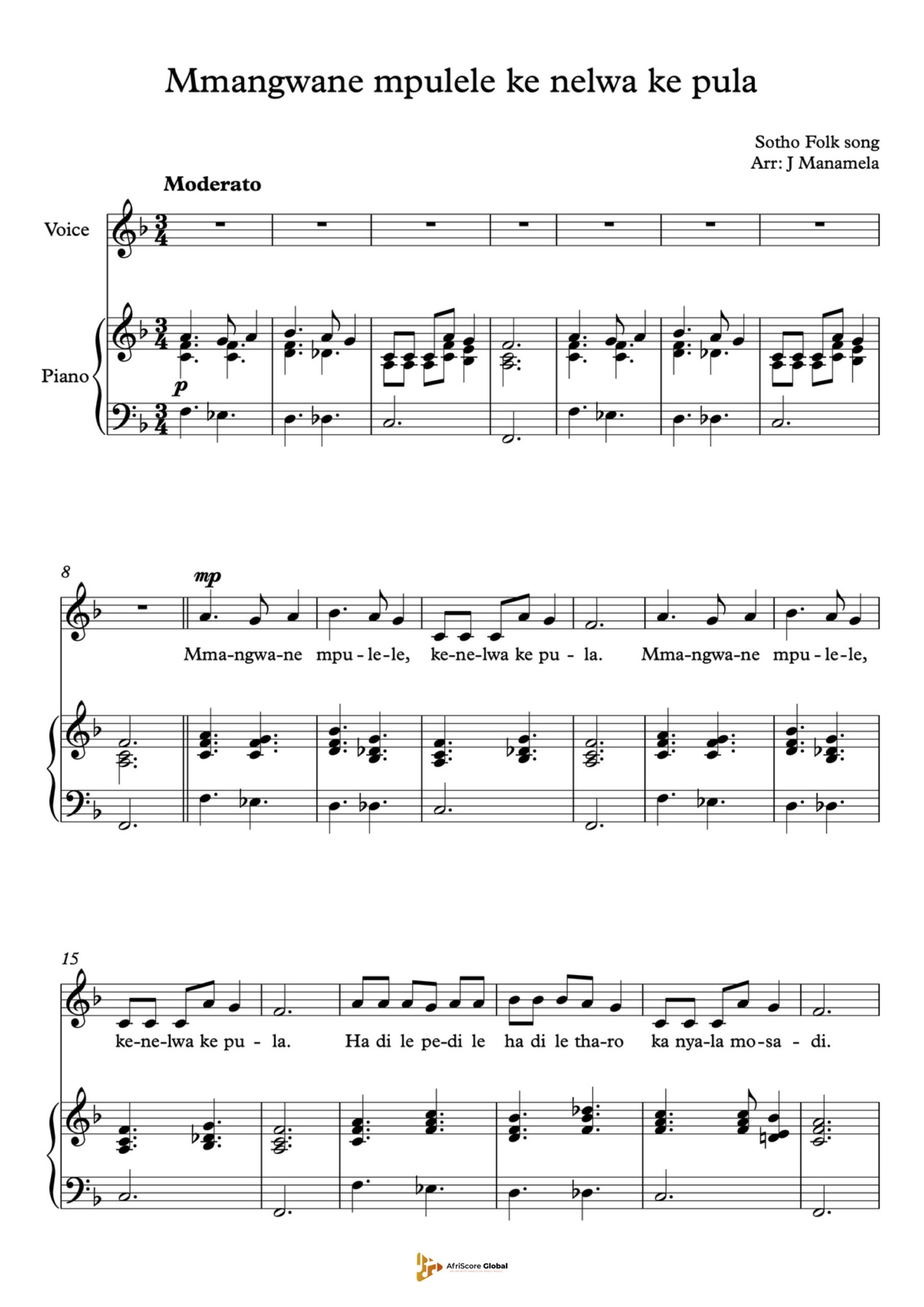 “Mangwani Mpulele” (also spelled Mangwane Mpulele) is a traditional Sotho folk song from Southern Africa. The title translates to “Aunt, open the door for me, I am getting wet in the rain,” with Mangwane referring to a mother’s younger sister. The song expresses a plea for shelter from the rain—an especially meaningful image in drought-prone regions—while some interpretations suggest deeper cultural symbolism, including themes of family relationships or marriage.