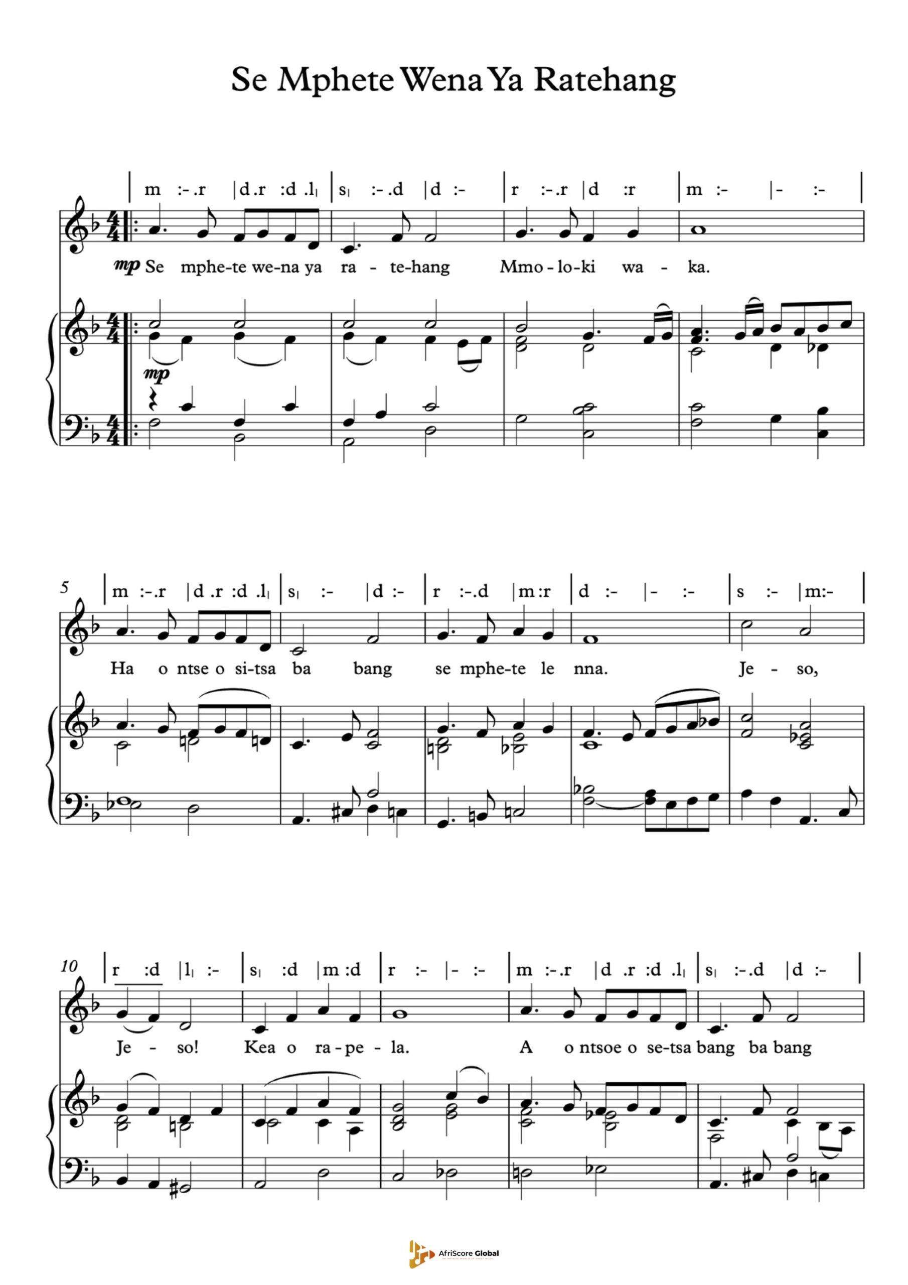 “Se Mphete Wena Ya Ratehang” is a cherished Sesotho hymn that translates to “Do Not Pass Me, Beloved One.” The song is a heartfelt plea for God’s attention, love, and blessings, emphasizing the singer’s reliance on divine grace. Its gentle melody and emotive lyrics make it a favorite in worship settings, resonating deeply with audiences seeking spiritual connection and reassurance.