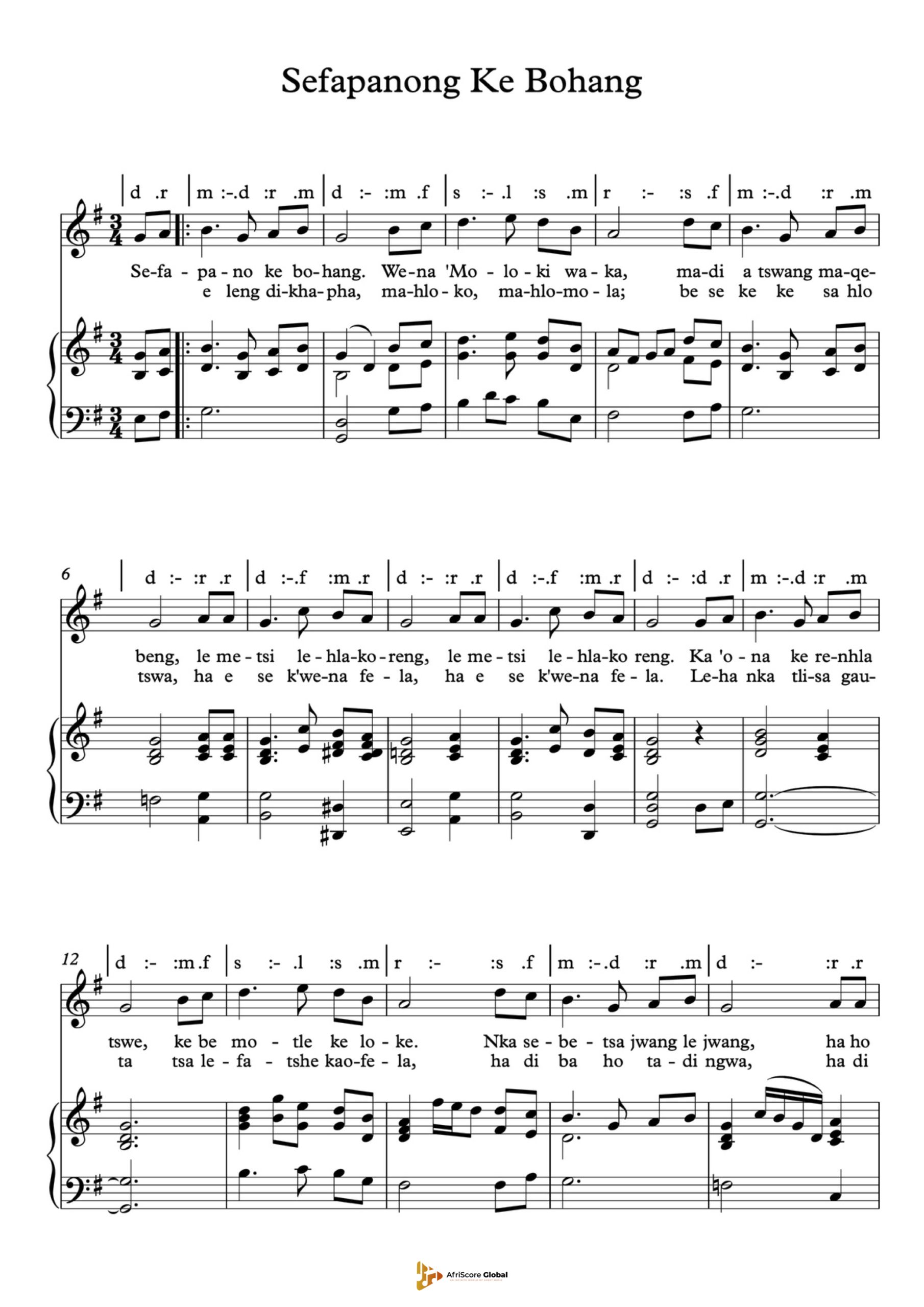 “Sefapano Se Bohang” is a profound Sesotho hymn that reflects on the redemptive power of Christ’s sacrifice on the cross. With vivid imagery of the cross and the blood and water from Christ’s side, the song portrays a heartfelt plea for cleansing, redemption, and grace. Its deeply spiritual lyrics acknowledge human helplessness without God and express reliance on Christ as the only source of salvation and peace. The hymn’s contemplative melody and moving message make it a treasured piece in worship, touching the hearts of all who sing it.